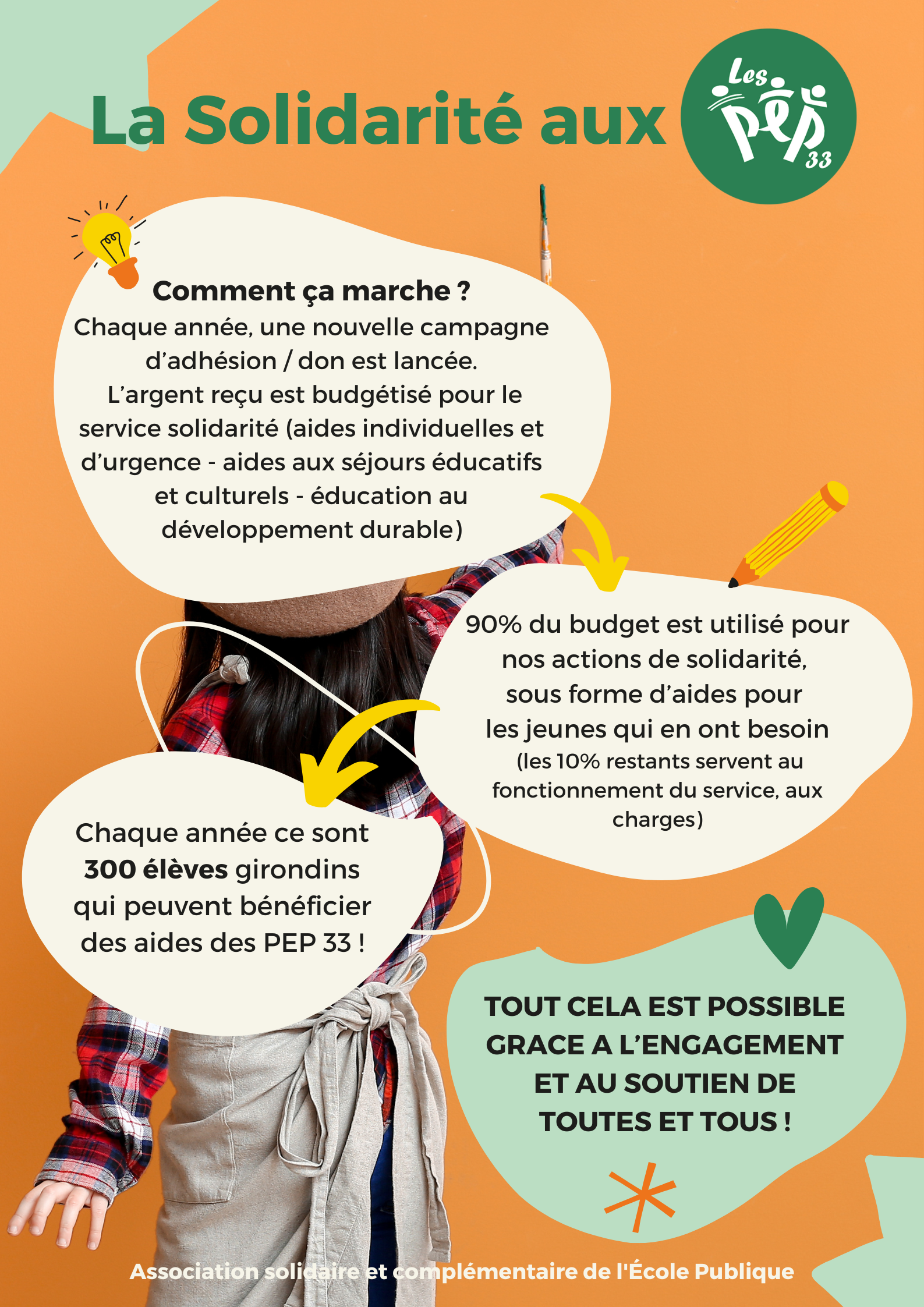 Les PEP 33 (Pupilles de l'enseignement public de la Gironde), une association girondine quasi centenaire avec pour vocation l’accompagnement des enfants et des jeunes en matière d’éducation et de culture où solidarité rime avec laïcité et citoyenneté. Des actions permanentes qui perdurent, se développent et s’harmonisent aujourd’hui avec l’accompagnement des jeunes mineurs non accompagnés pour une autonomie sur le sol français. Fidèle à ses grands principes, l’association œuvre discrètement et efficacement avec des hommes et des femmes impliqués et sensibilisés par les problèmes sociétaux touchant plus particulièrement les enfants.